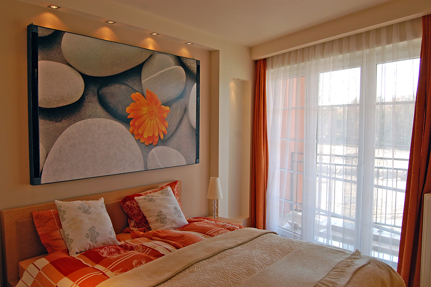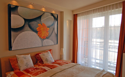 W sypialni jest duże wygodne łóżko małżeńskie, szafa garderobiana oraz lampki nocne. Z sypialni mamy także bezpośrednie wyjście na balkon.