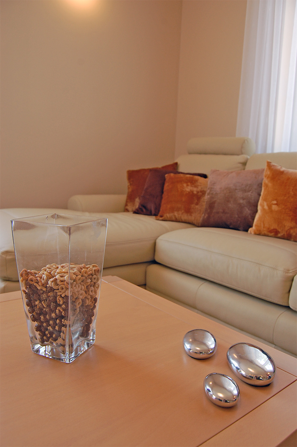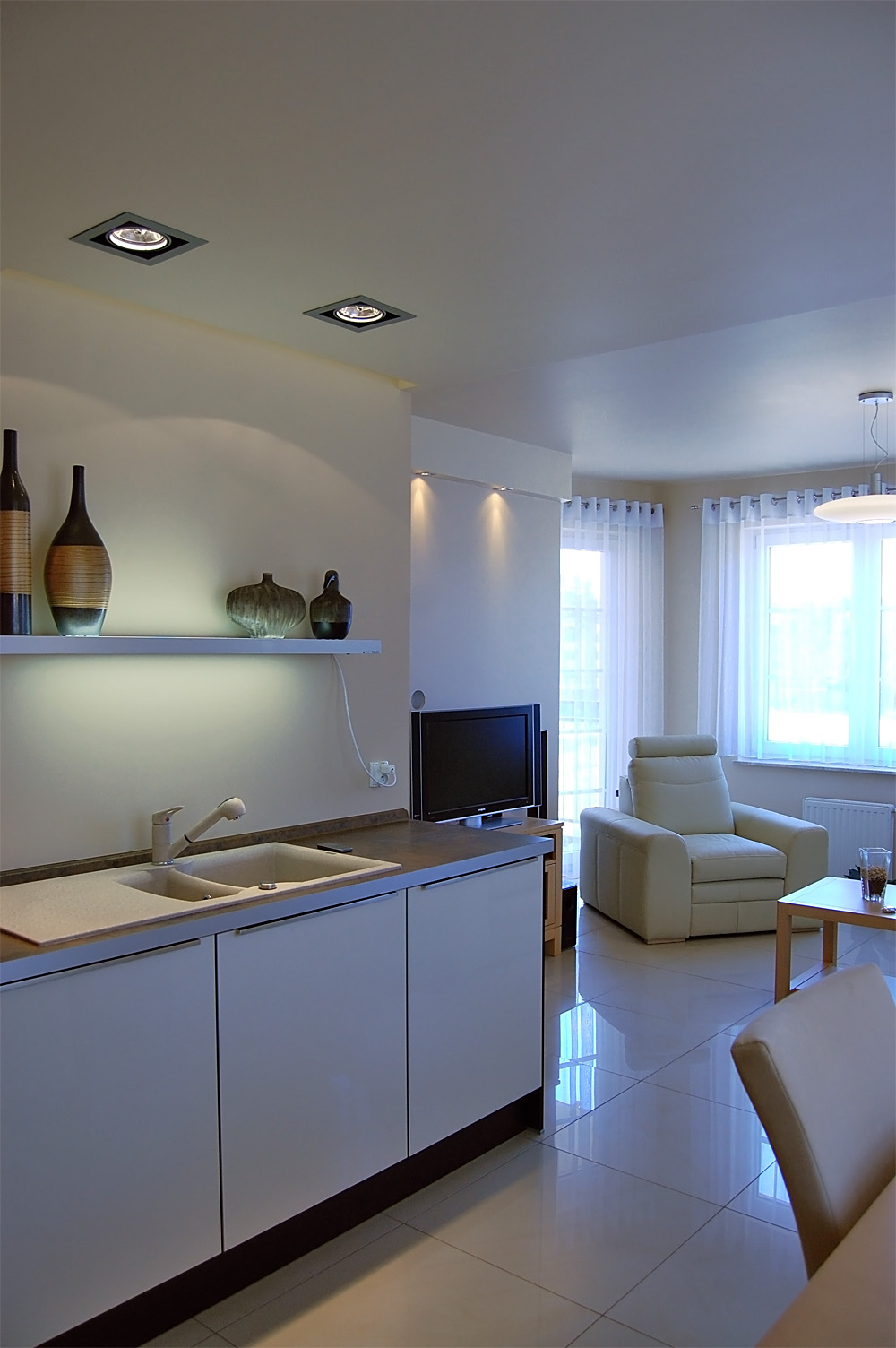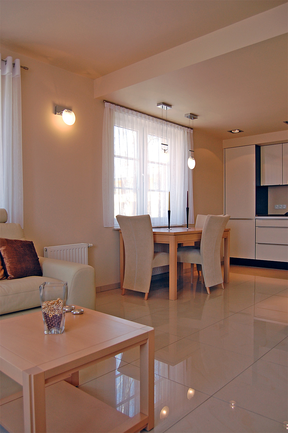 Apartament jest urządzony nowocześnie i tak, że zapewnia komfort oraz wygodę osobom w nim przebywającym. Składa się on z pokoju dziennego połączonego z aneksem kuchennym. Z tego też pokoju jest bezpośrednie wyjście na balkon. W salonie znajduje się nowoczesny skórzany narożnik z funkcją spania dla dwóch osób, komoda, odbiornik TV, odtwarzacz DVD, stół z czteroma krzesłami oraz stolik.