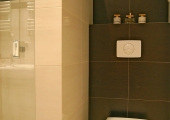 Łazienka jest  jasna i komfortowa z prysznicem, umywalką, lustrem oraz WC.