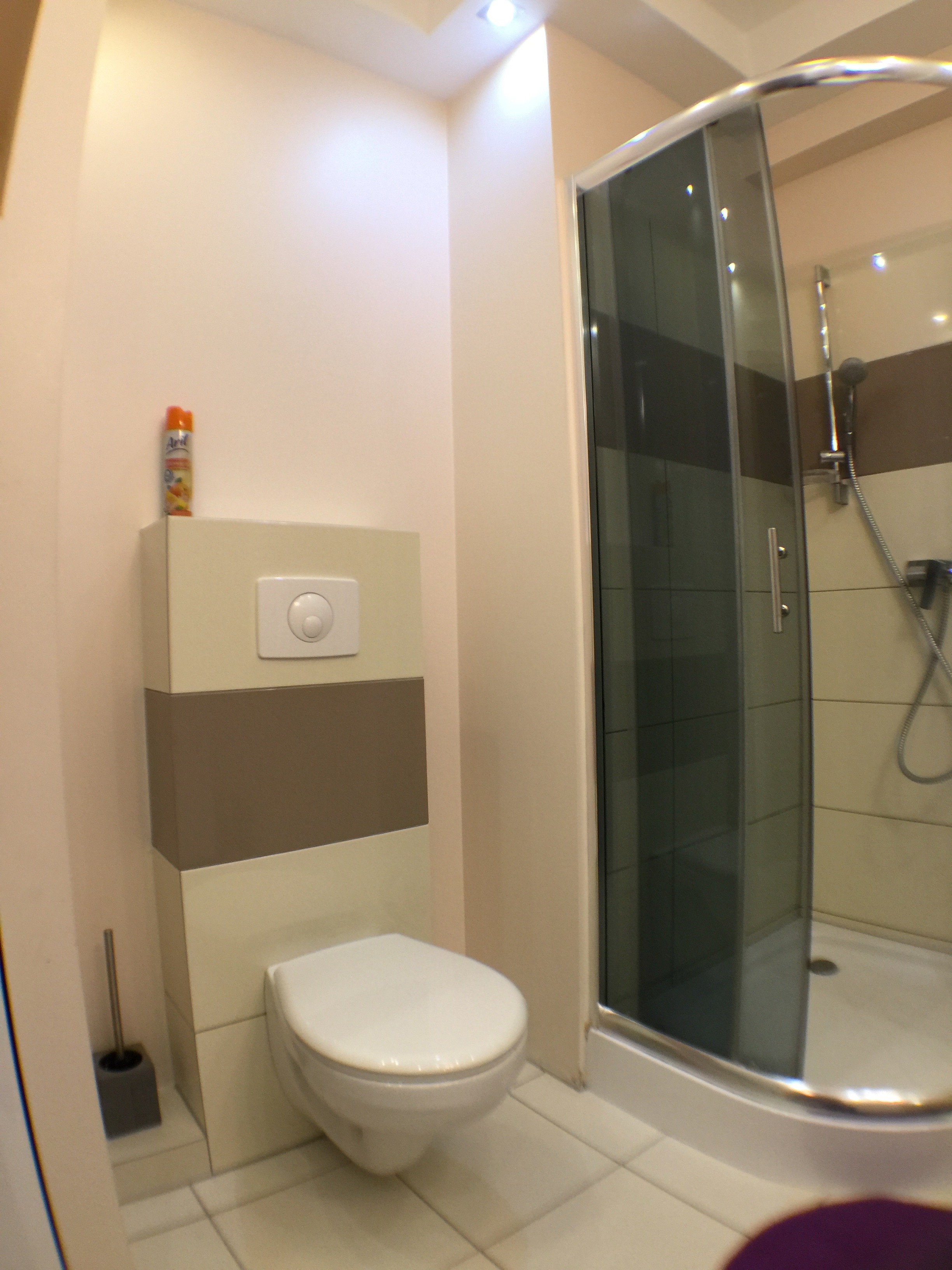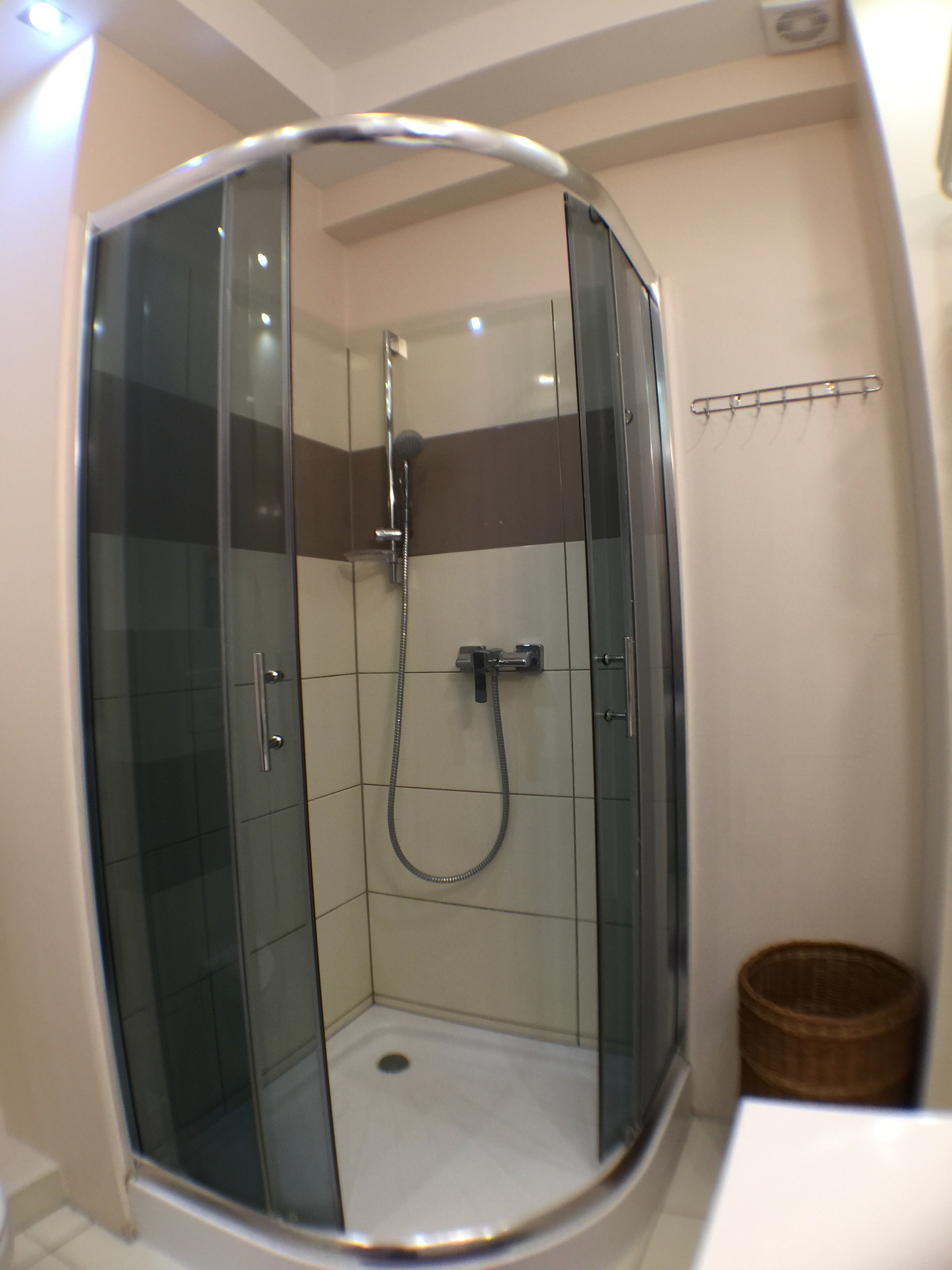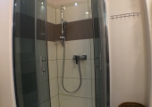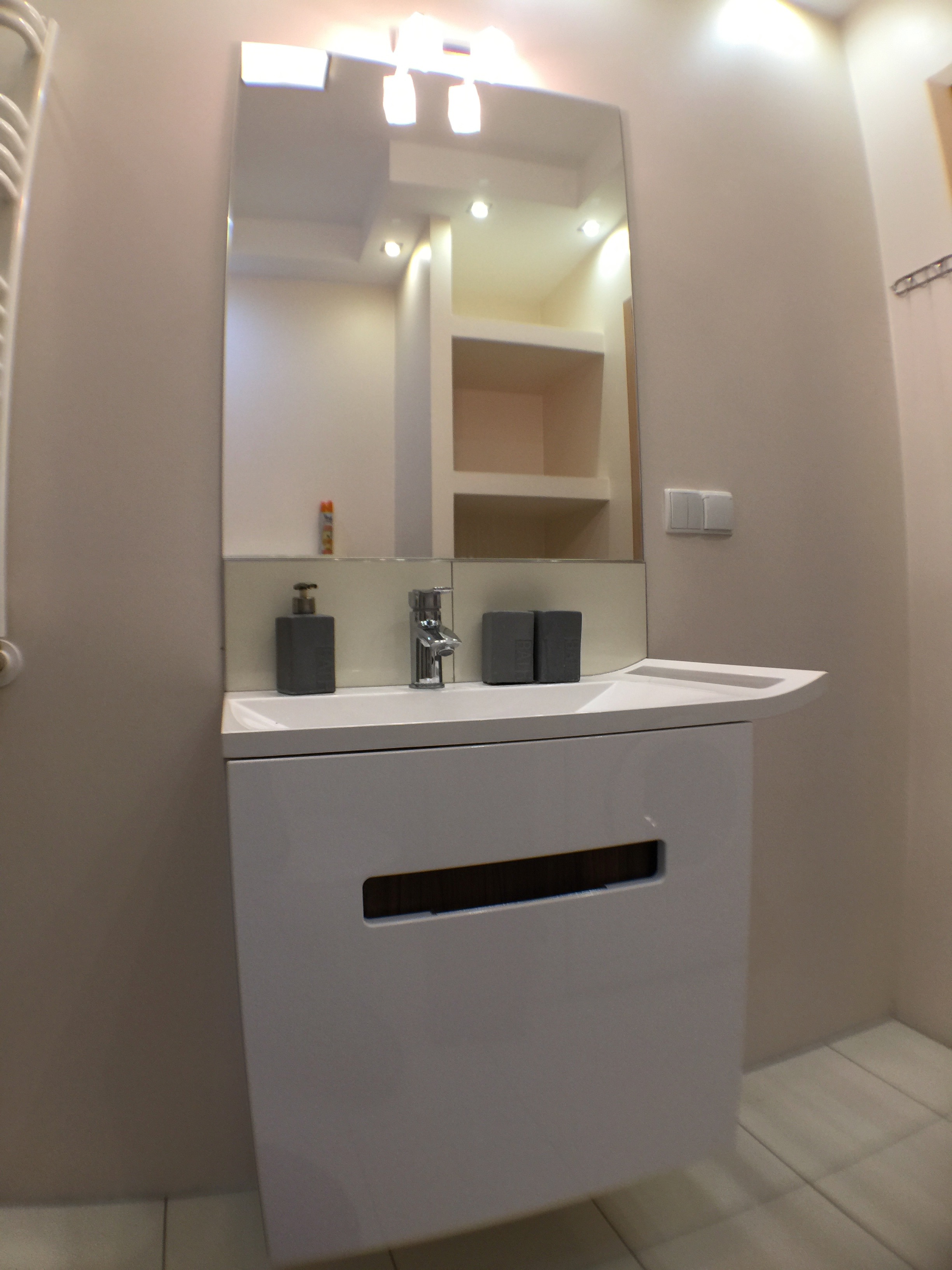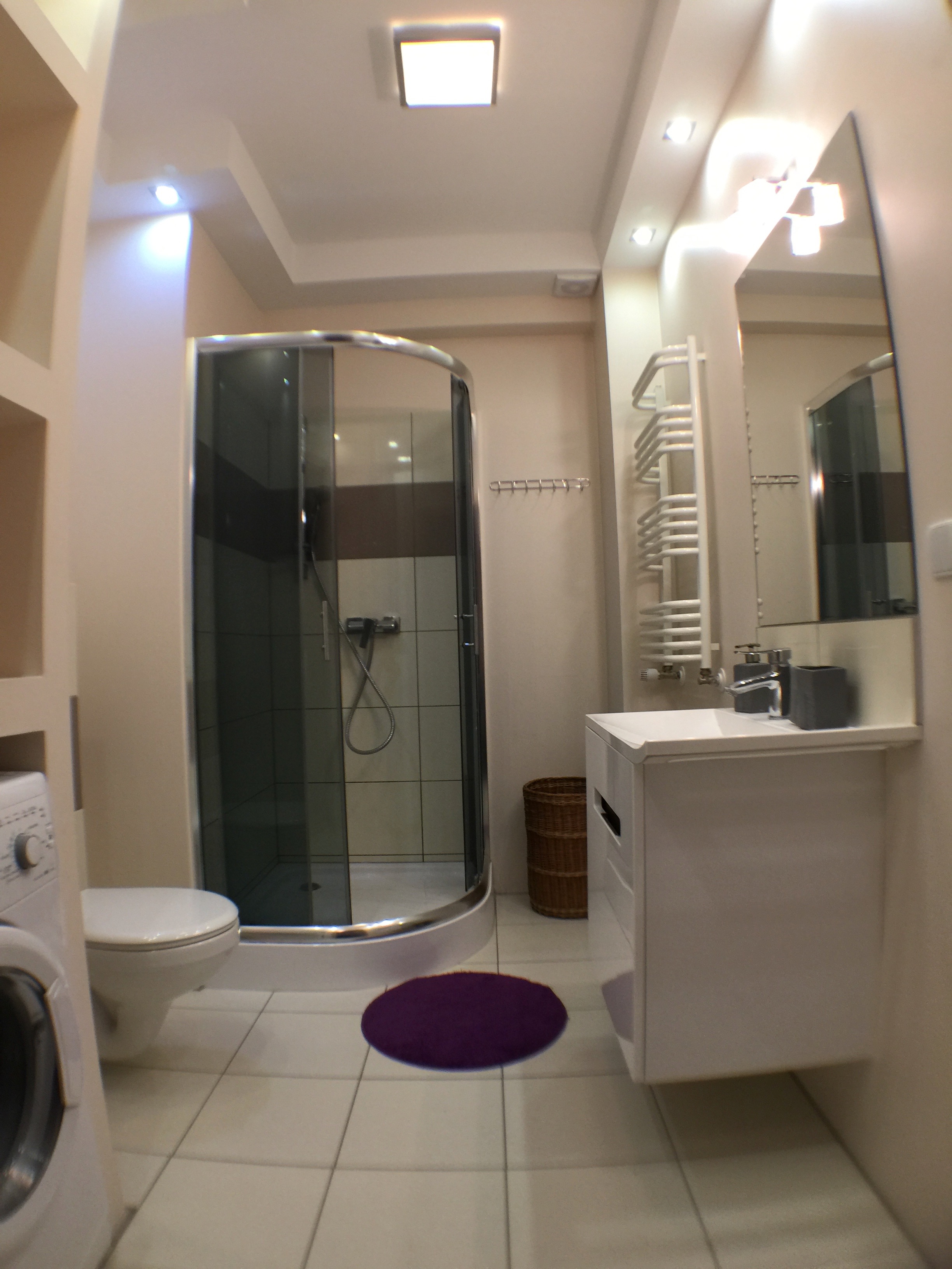Łazienka jest  duża z kabiną prysznicową, umywalką, lustrem oraz WC.