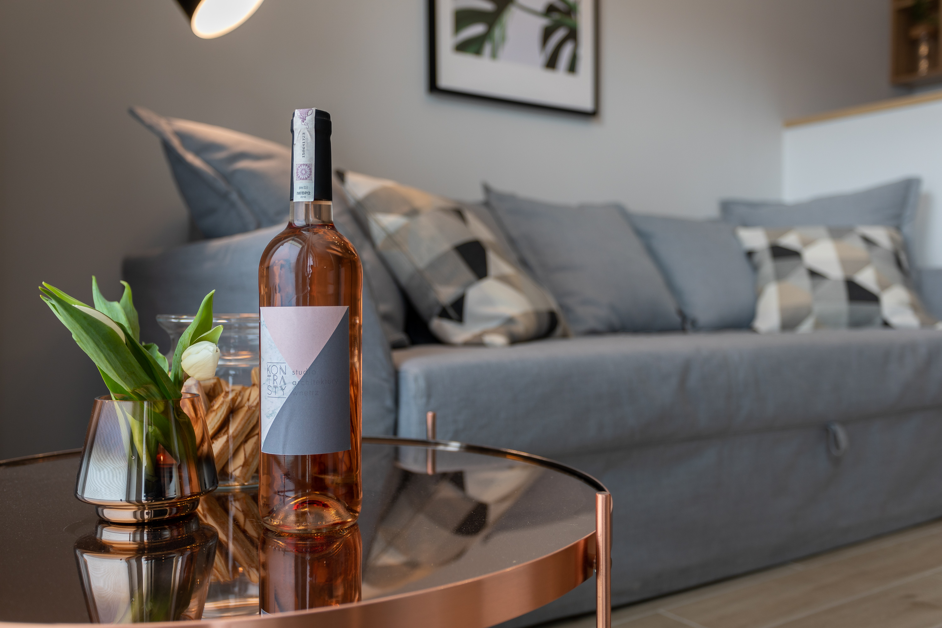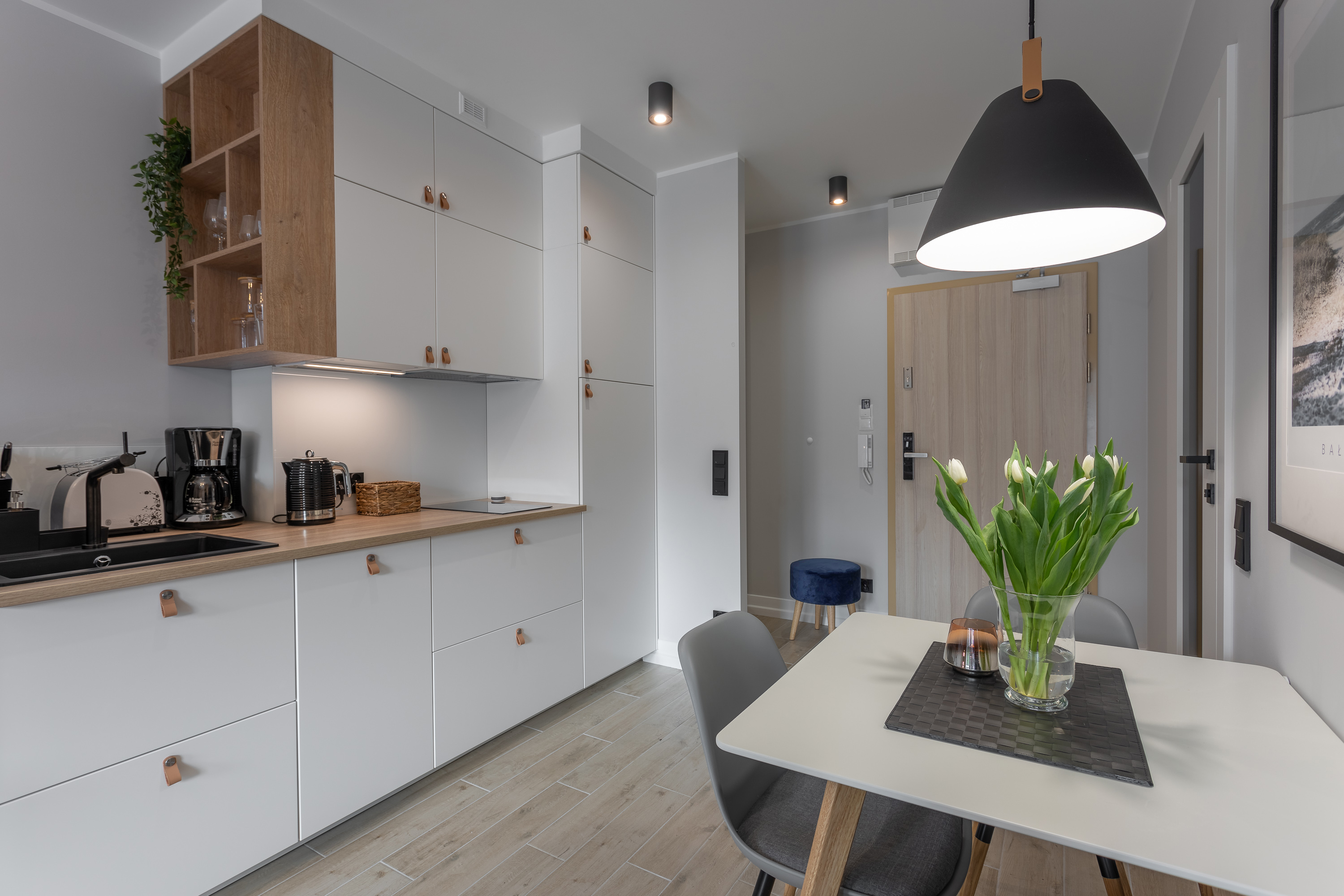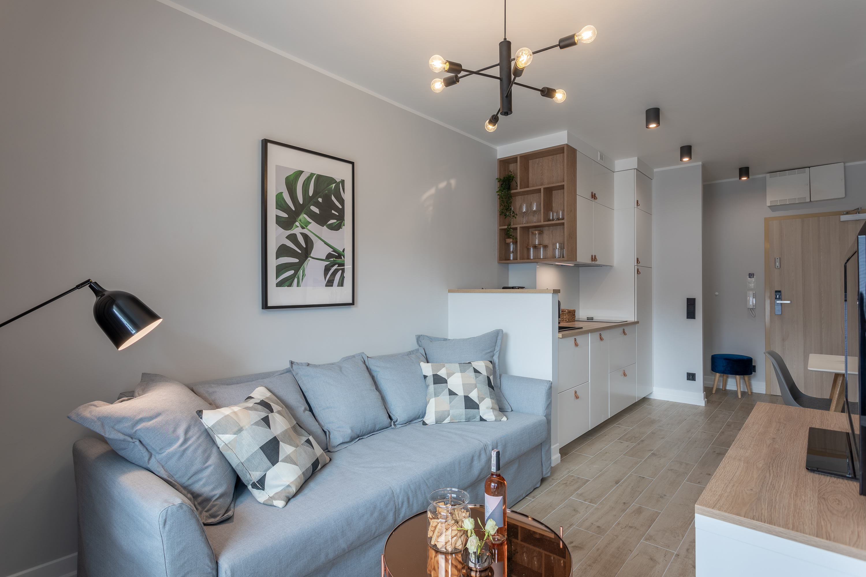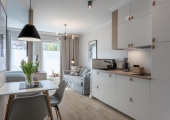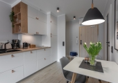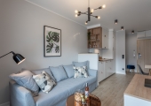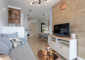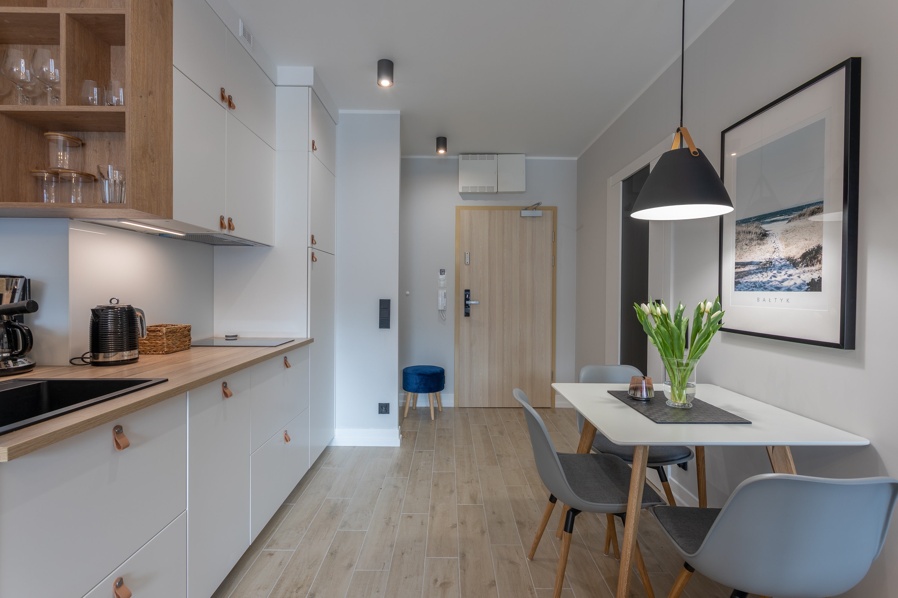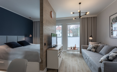 Bardzo ładnie oraz nowocześnie urządzony  apartament składający się z pokoju dziennego z aneksem kuchennym oraz łazienki i balkonu. Położony jest on na I piętrze w  czteropiętrowym budynku z windą. Apartament jest usytułowany na terenie kompleksu hotelowo – parkowego na ul. Wyspiańskiego w Świnoujściu.