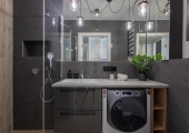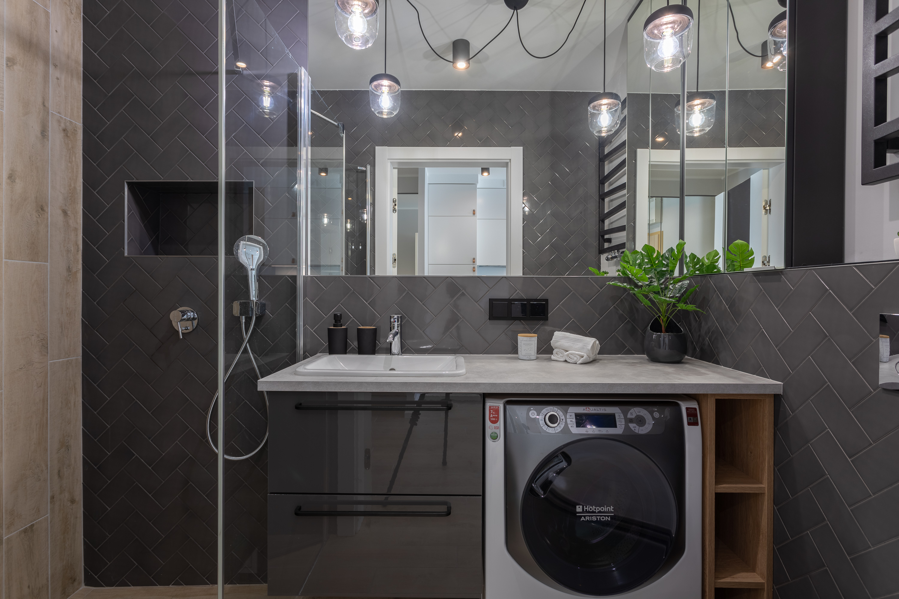 Łazienka ma dużą kabina prysznicową z deszczownicą, umywalkę, duże lustro, pralkę, suszarkę do włosów oraz WC.