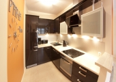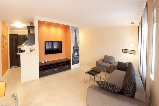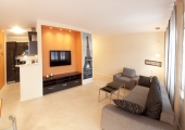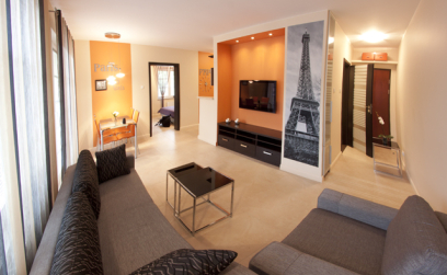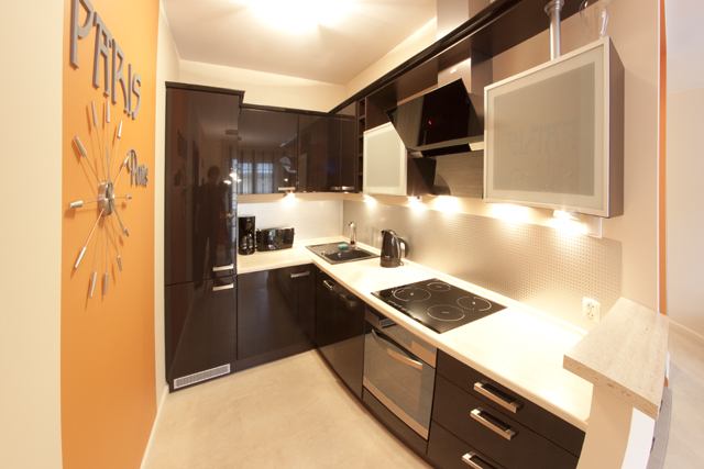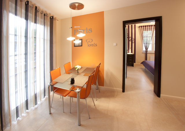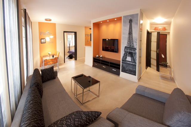 Apartament jest urządzony nowocześnie i tak, że zapewnia komfort oraz wygodę osobom w nim przebywającym. Składa się on z pokoju dziennego połączonego z aneksem kuchennym. Z tego też pokoju jest bezpośrednie wyjście na balkon.